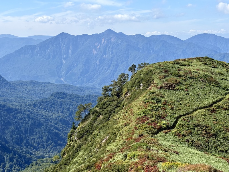 ツメは大した藪もなく稜線に飛び出し、見覚えのある水平の頂稜の苗場山、ツンとした山頂の鳥甲山が出迎えてくれた。